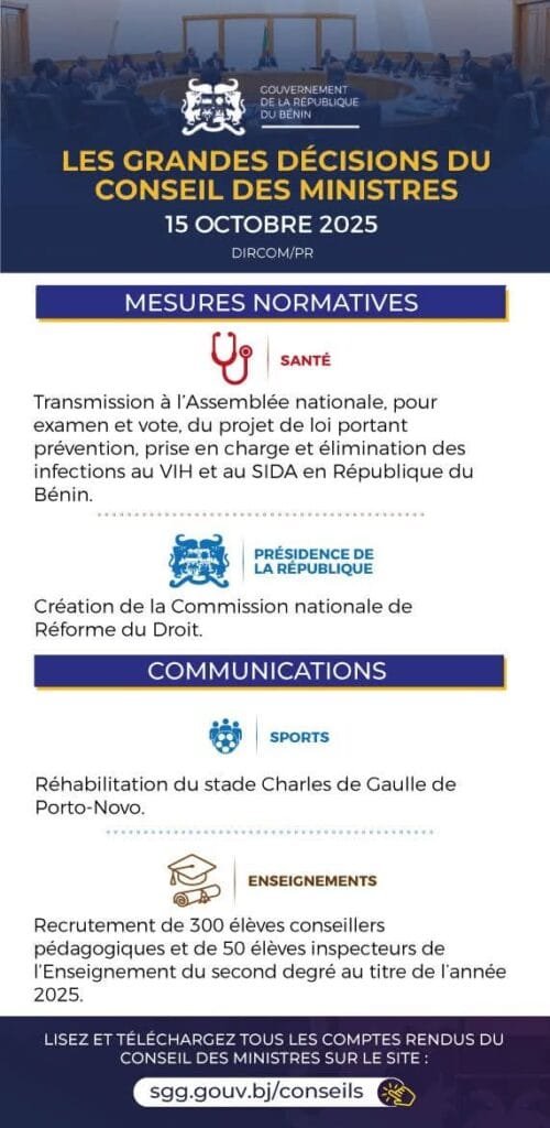 Le gouvernement béninois s’est réuni en Conseil des ministres ce mercredi 15 octobre 2025 sous la présidence du chef de l’État. Plusieurs décisions importantes ont été prises, touchant divers secteurs de la vie nationale.