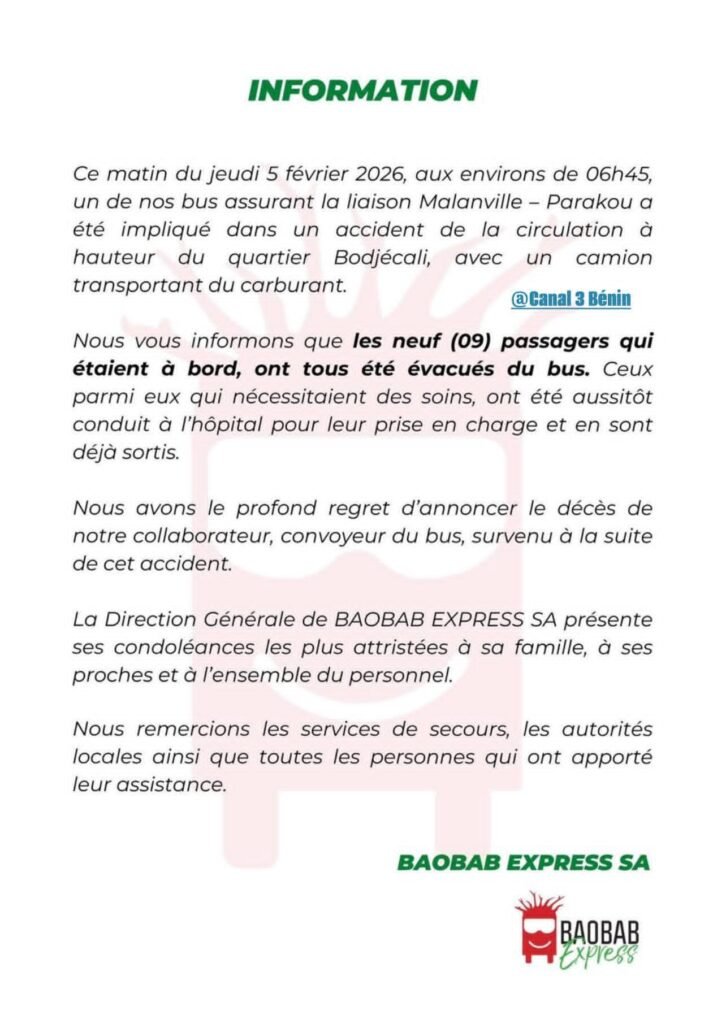 La Direction générale de Baobab Express SA a rendu public un communiqué officiel à la suite de l’accident de circulation impliquant l’un de ses bus, survenu dans la matinée du jeudi 5 février 2026, aux environs de 06h45, à hauteur du quartier Bodjécali, dans le département du Borgou.