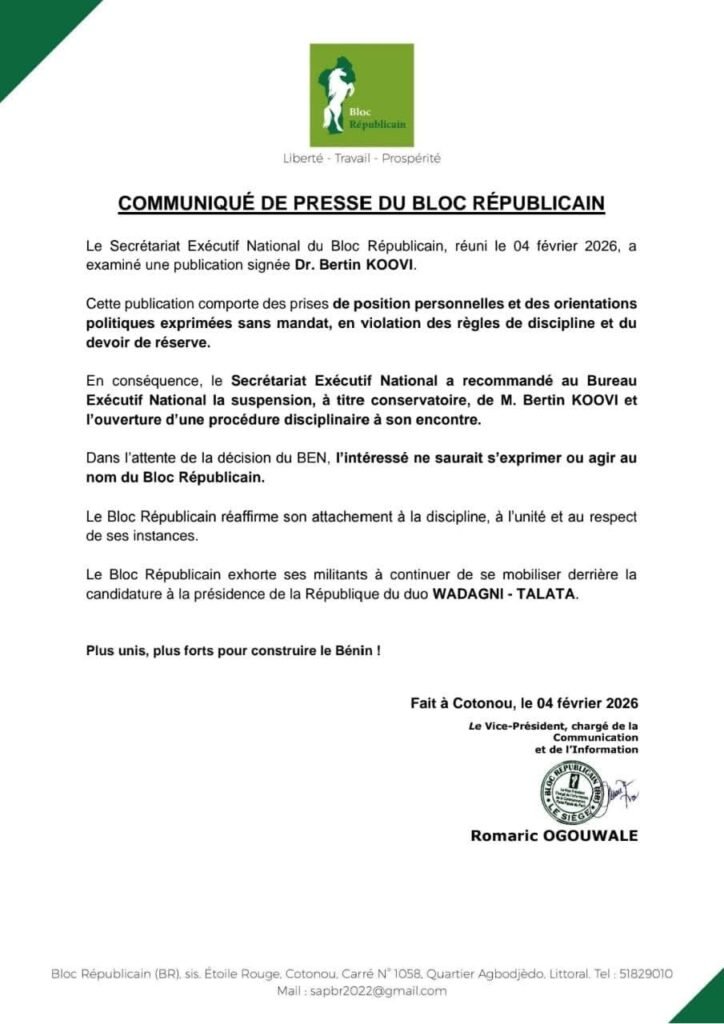 Face à ce manquement, le SEN a recommandé au Bureau Exécutif National (BEN) la suspension conservatoire de l’intéressé, assortie de l’ouverture d’une procédure disciplinaire à son encontre. Dans l’intervalle, Dr Bertin Koovi est formellement interdit de toute prise de parole ou action au nom du Bloc Républicain, dans l’attente de la décision finale du BEN.
